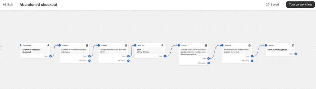 A new system is available, but it’s significantly more complex than before–you must now configure “workflows” with timing, conditions and other things to make sure your customers get their emails. Thankfully, Shopify provides a template for this called “Abandoned Checkout”, which looks like this: